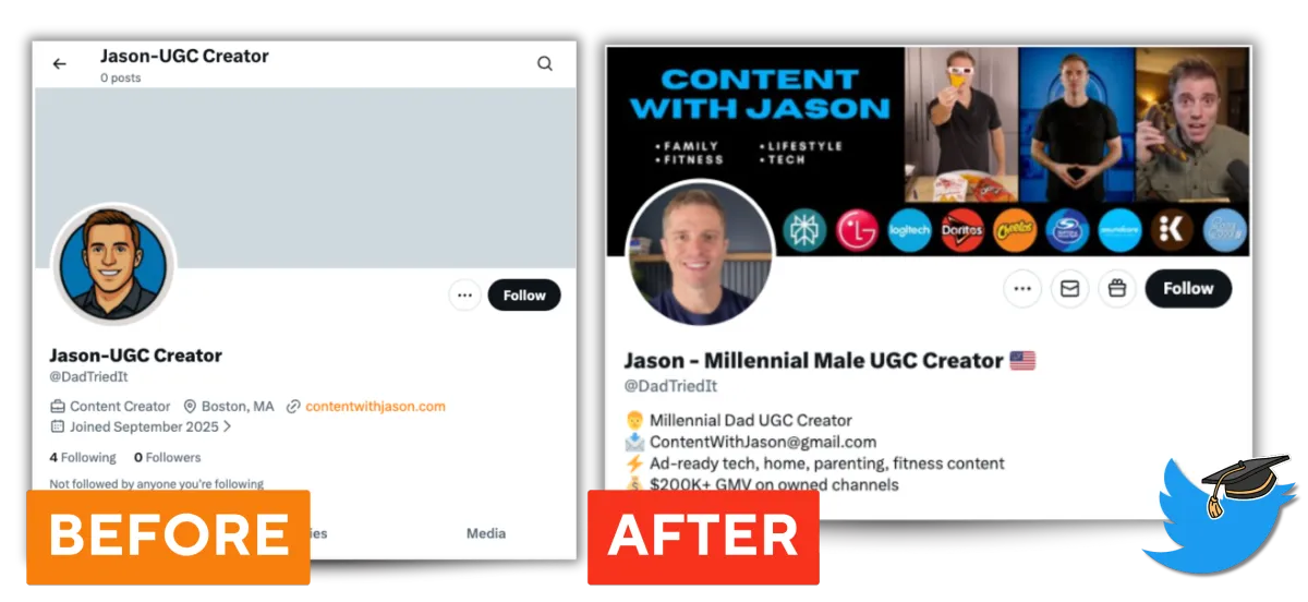 Set up and optimize your Twitter completely so brands instantly know you're a professional UGC creator worth DMing. You’ll have absolutely everything you need to look credible, searchable, and hire-ready.